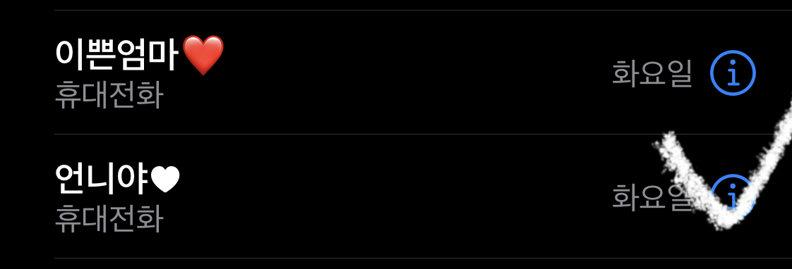 어릴 때 저장한 이름 그대로 안 바꿔서 조금 부끄럽지만 ㅋㅋㅋㅋㅋ 여기서 막간 복습을 해보자면 ㅎㅎ 위에 하트는 아이폰 하트, 아래 하트는 안드로이드 하트이다.